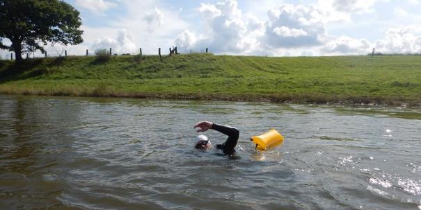 Gegen 8:00 Uhr sind wir in der Gruppe durch das Freibad auf der anderen Seite zum Start beim Kanuclub Rinteln marschiert. Letzte Vorbereitungen vor dem Start um 9:00 Uhr. Neoprenanzug zurechtzurren, mit Melkfett einschmieren, die „Restube“ Rettungsboje umschnallen, die aus Sicherheitsgründen und so auch üblich bei Langstreckenschwimmen immer am Körper getragen werden musste, und den Rucksack noch einmal kontrollieren.